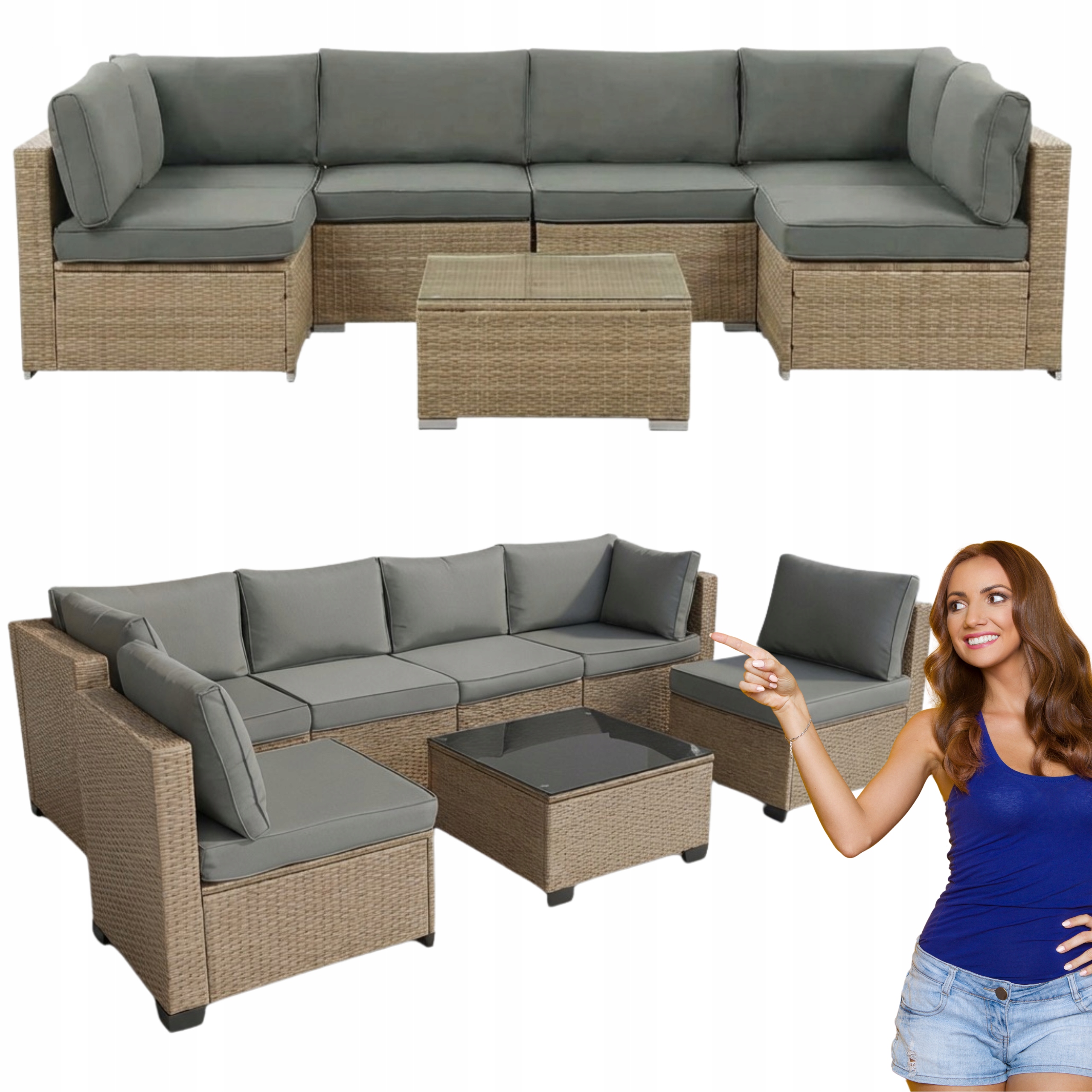 ZESTAW Mebli OGRODOWYCH Narożnik MODUŁOWY Fotel Stolik Podnóżek Rattan